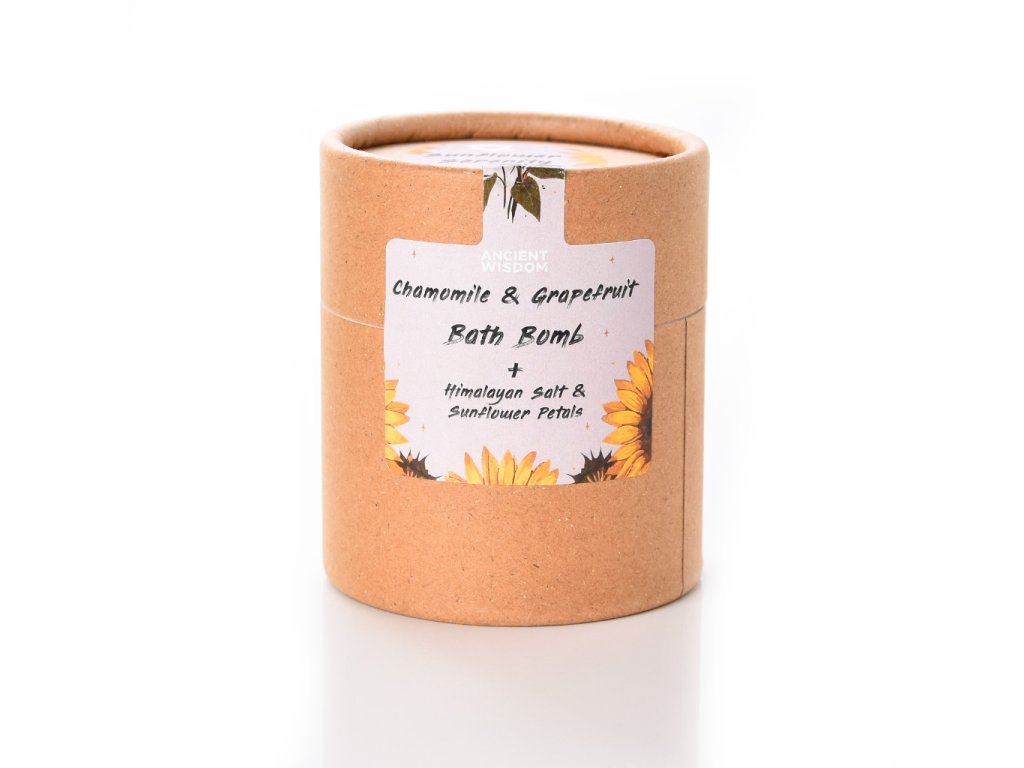 Dopřejte si uklidňující koupelový rituál se šumivou bombou obohacenou o přírodní esenciální oleje z heřmánku a grapefruitu. Jemná vůně navozuje harmonii a uvolnění, zatímco himálajská sůl plná minerálů regeneruje pokožku. Zářivé okvětní lístky slunečnice dotvářejí atmosféru jemné péče. Ručně vyrobeno v Británii s respektem k přírodě – pro chvíle skutečné pohody.