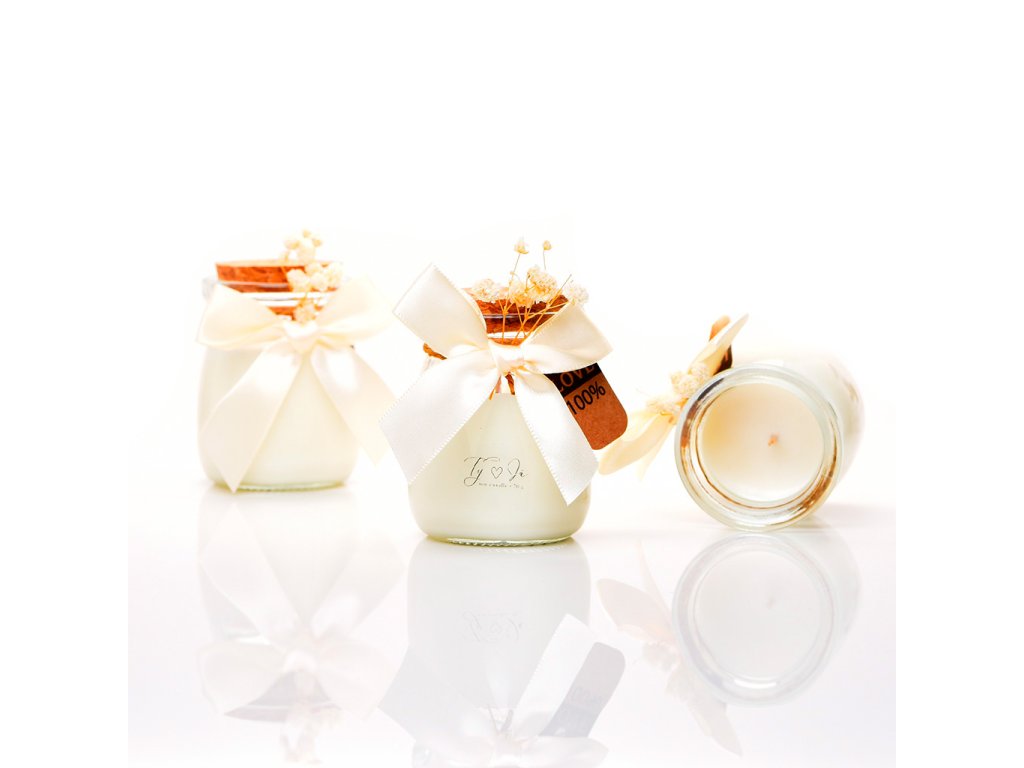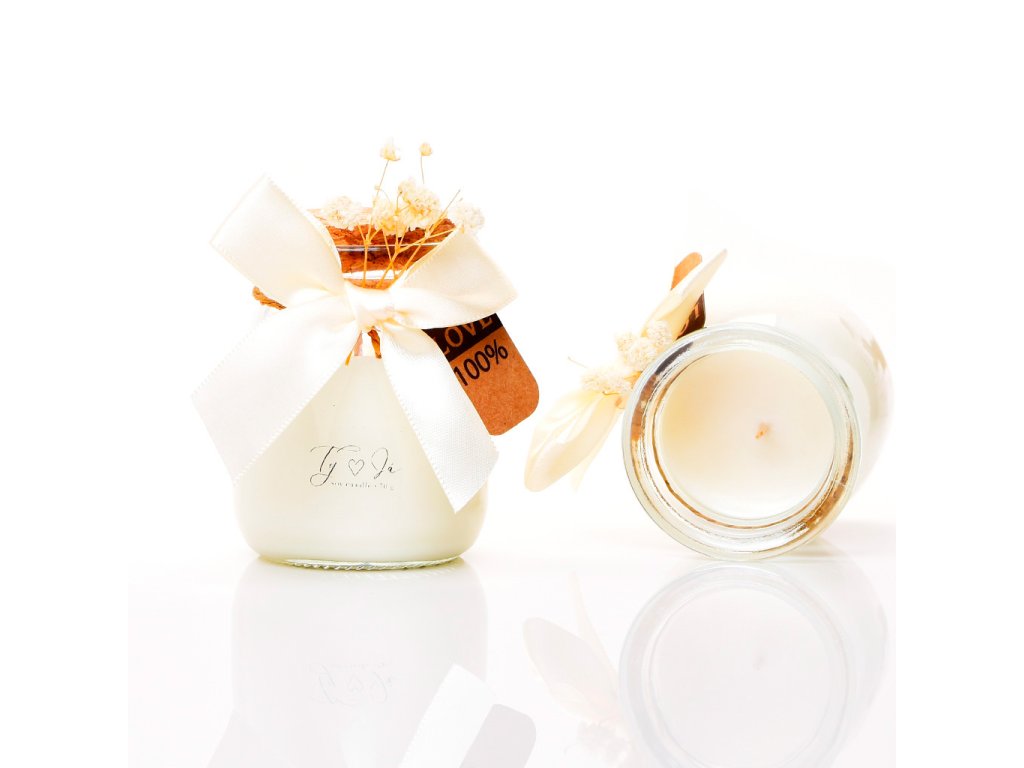 Jemná vonná svíčka ze sójového vosku je krásným doplňkem svatební tabule, milou pozorností pro hosty i elegantním drobným dárkem z lásky. Díky svému něžnému vzhledu, dekorativní mašli a romantickému detailu působí slavnostně, vkusně a přirozeně.