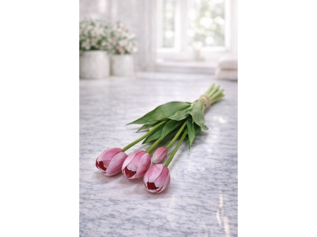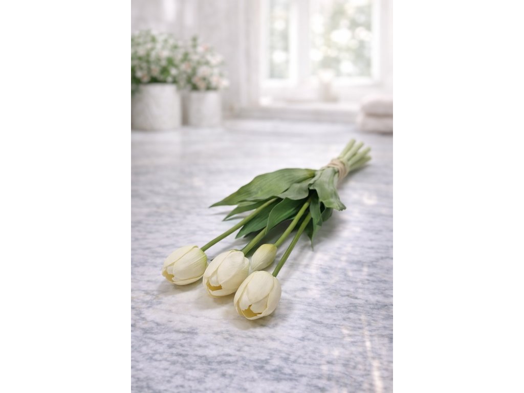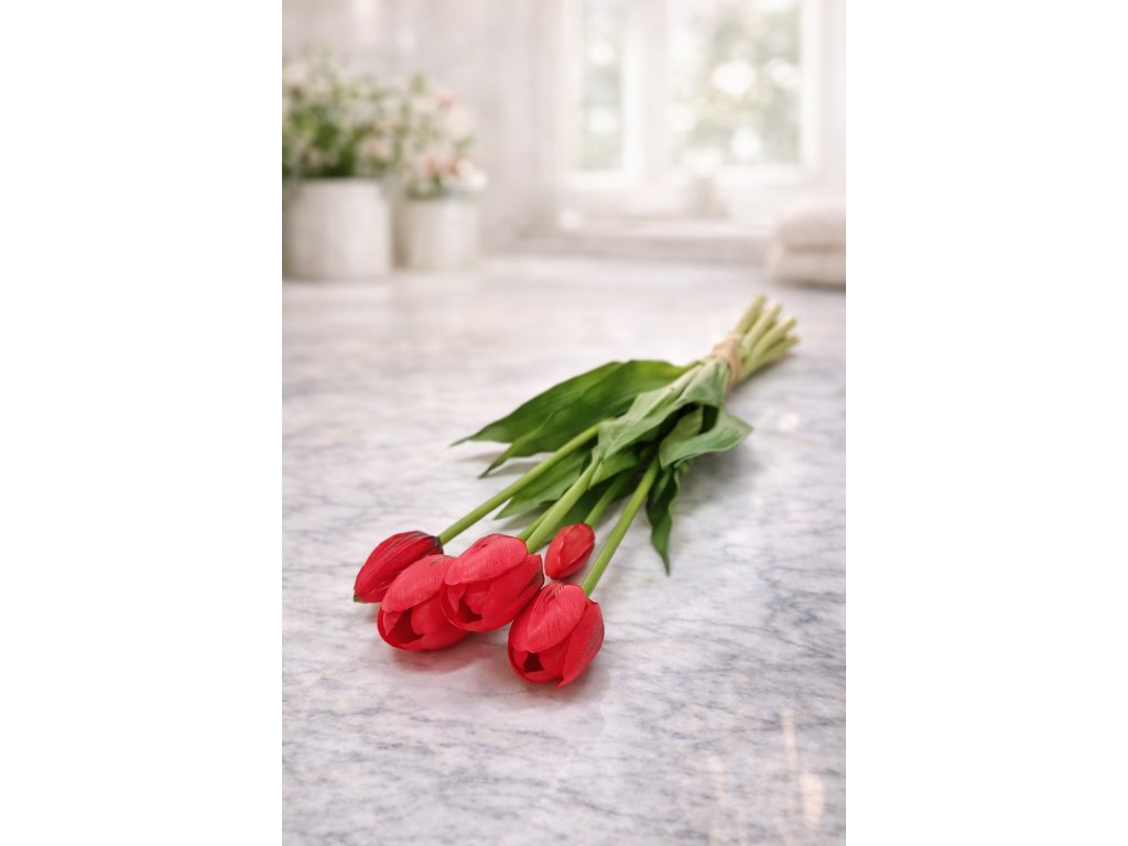 Elegantní svazek 5 umělých tulipánů je krásnou dekorací, která přinese do interiéru svěží jarní atmosféru po celý rok. Tulipány jsou vyrobeny z kvalitního gumového materiálu, díky kterému působí velmi realisticky – na pohled i na dotek připomínají skutečné květiny.